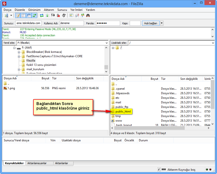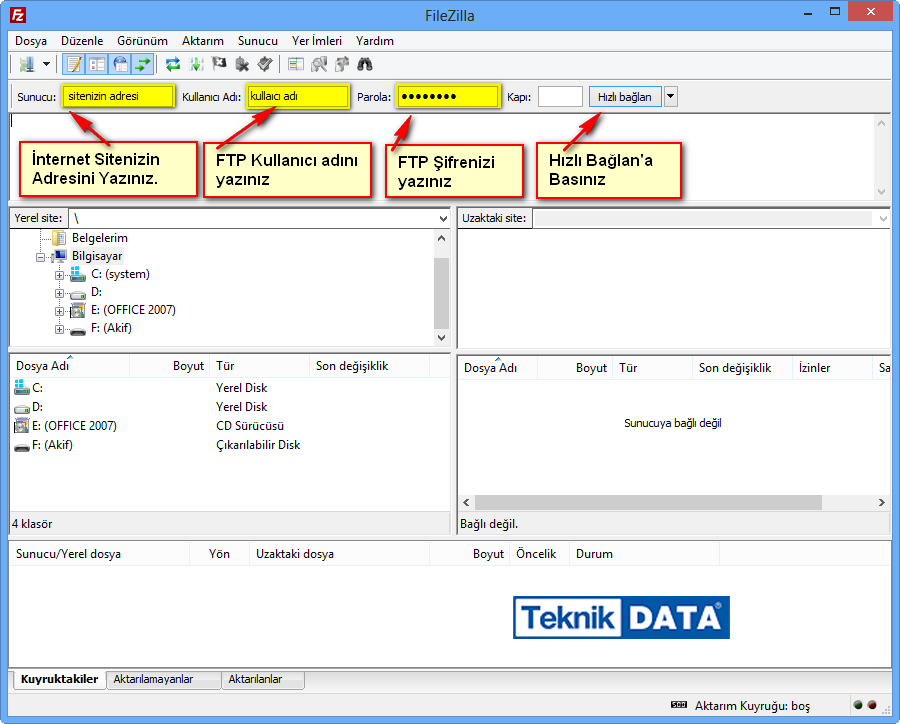Açıklama; 1.) Hostunuzun verdiği Ip No veya site adresini giriyosunuz.2.) Kullanıcı adınızı,hostunuzdan aldığınız veya sağladığı.3.) Hostunuzun sağladığı şifre veya sizin belirlediğiniz şifreyi...